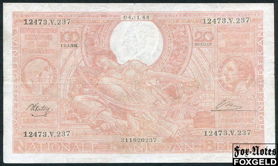 ОПИСАНИЕ / ПРИМЕЧАНИЯ: 100 Francs-20 Belgas 04.11.44 На АВ фламандский текст