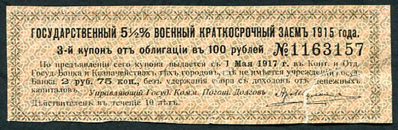 Купон Государственного 5 1/2% Военного Краткосрочного Займа 1915 года