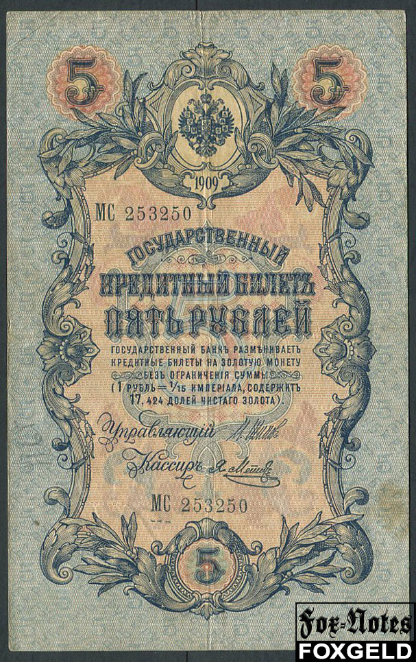 Российская Империя 5 рублей 1909 Шипов Я. Метц Императорское Пр-во F FN:83.2 180 РУБ