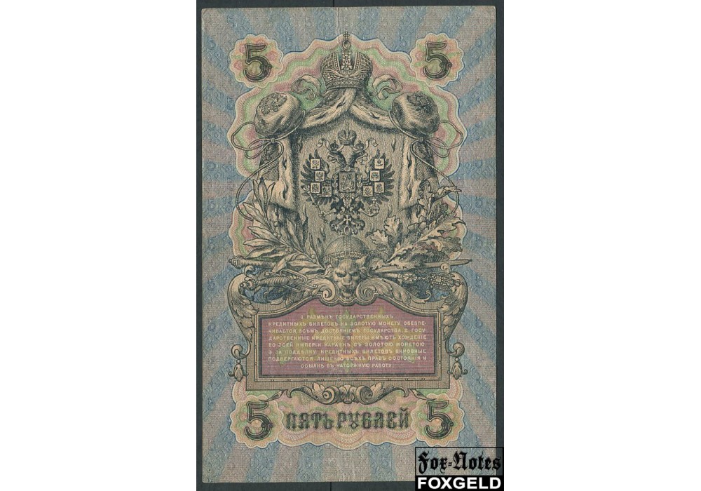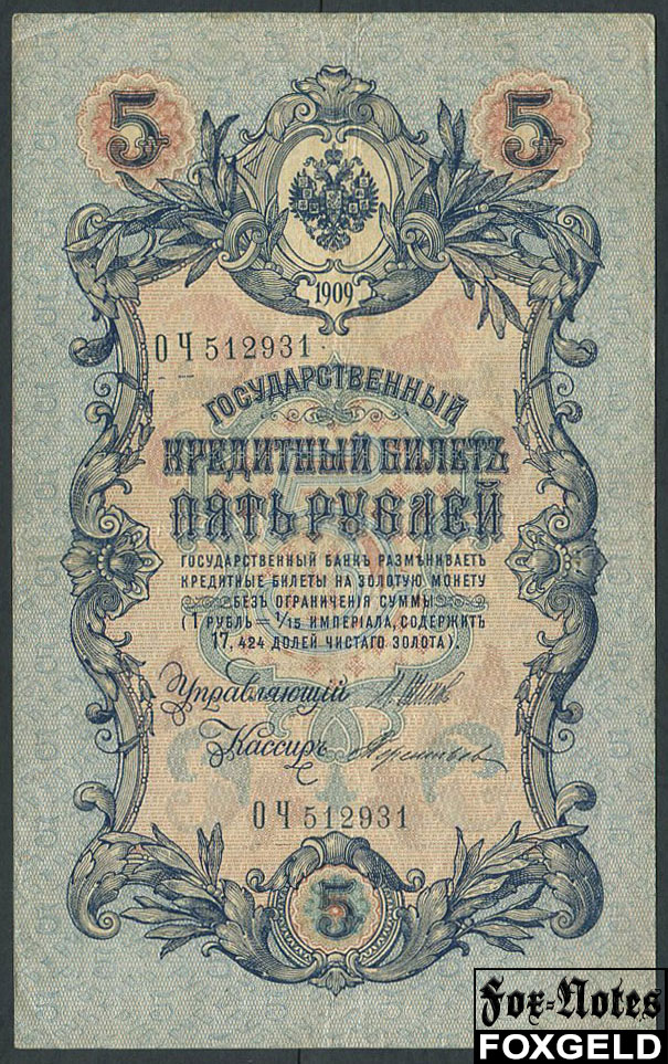 Российская Империя 5 рублей 1909 Шипов Терентьев Временное Пр-во F FN:83.2 180 РУБ