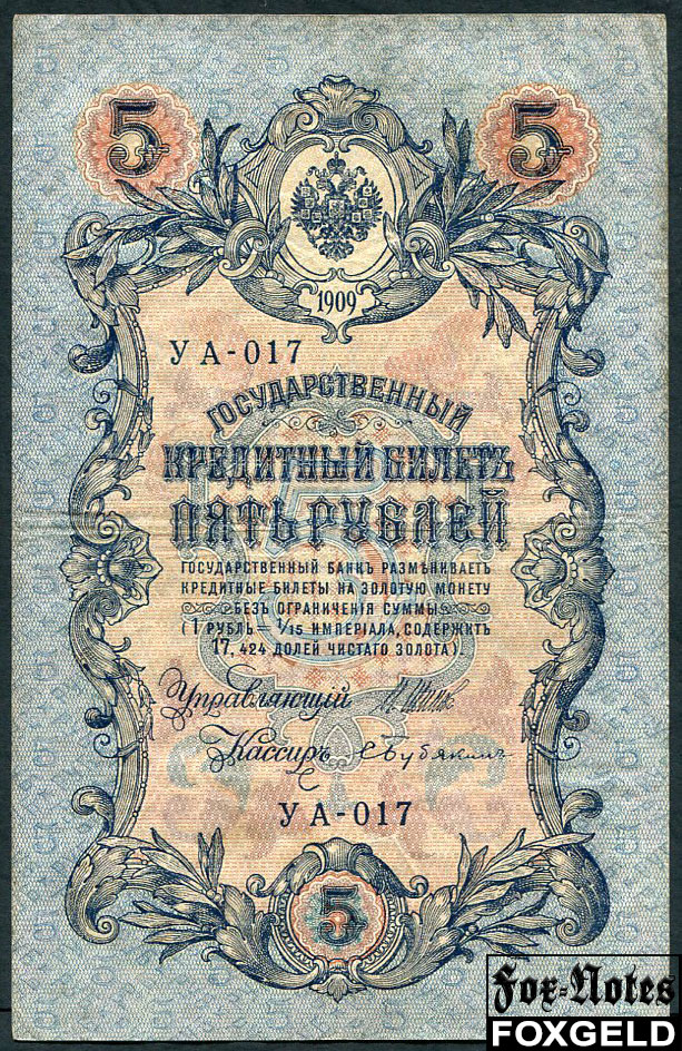 Российская республика 5 рублей 1909 (1917) Выпуск Временного правительства, Бубякин F FN:83.3 200 РУБ