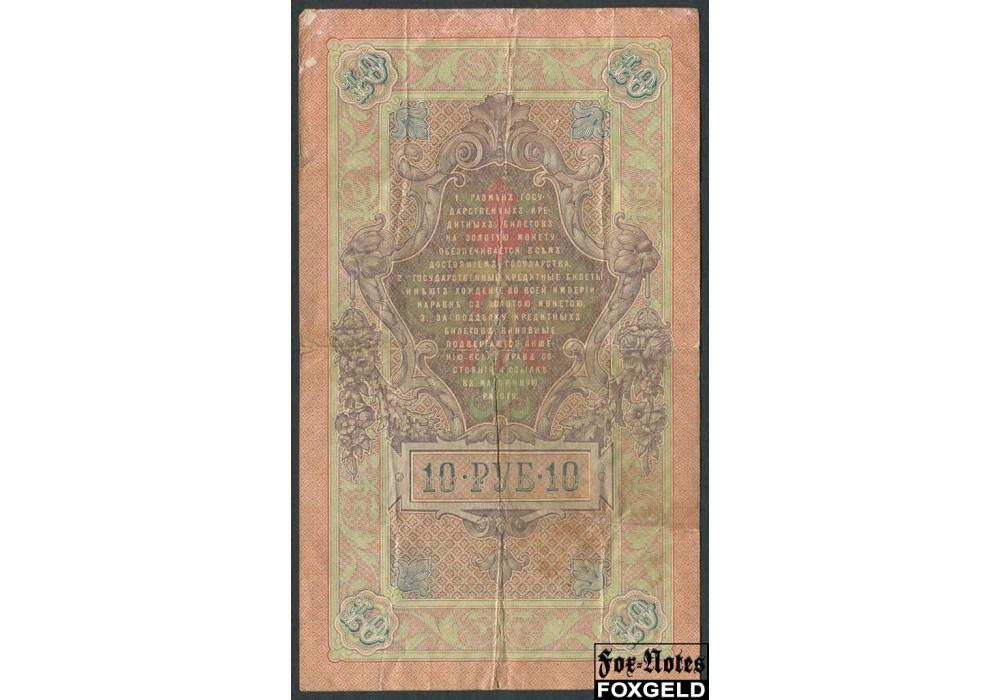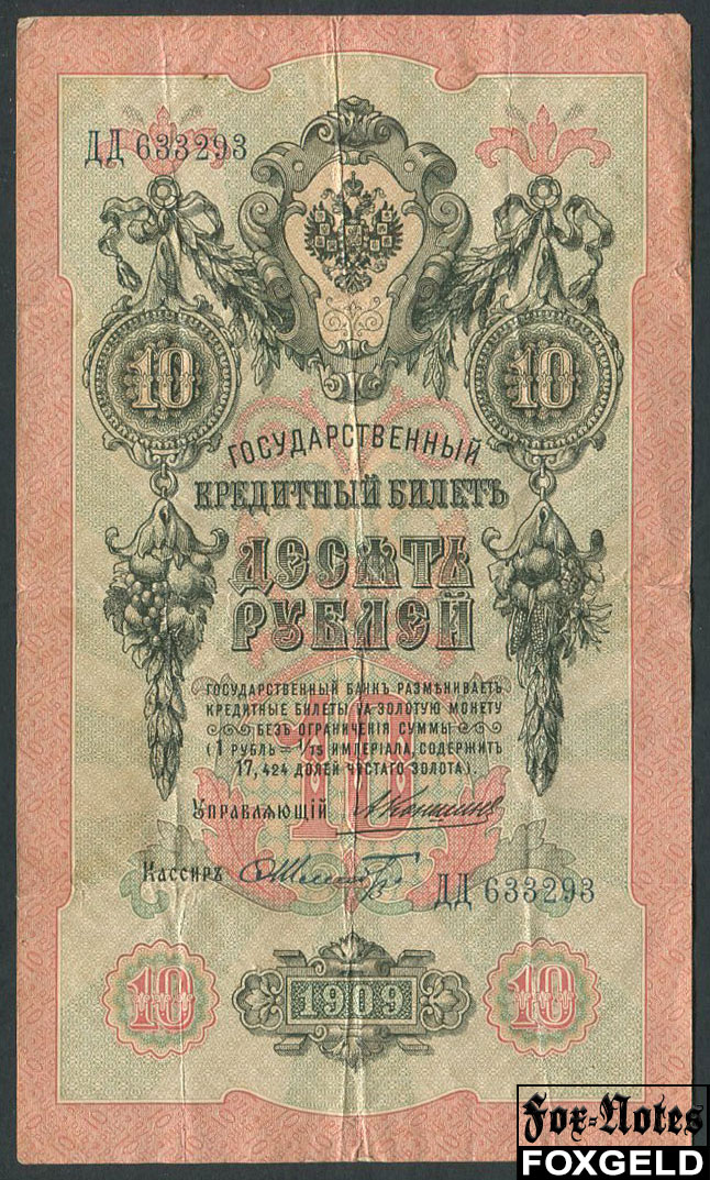 Российская Империя 10 рублей 1909 Коншин Шмидт F FN:84.2 400 РУБ