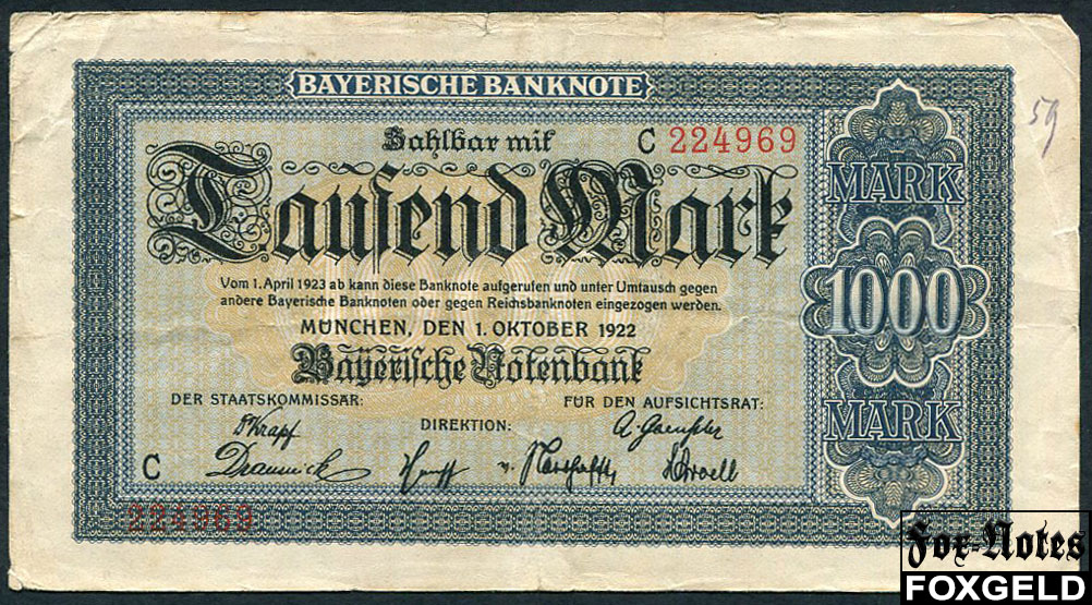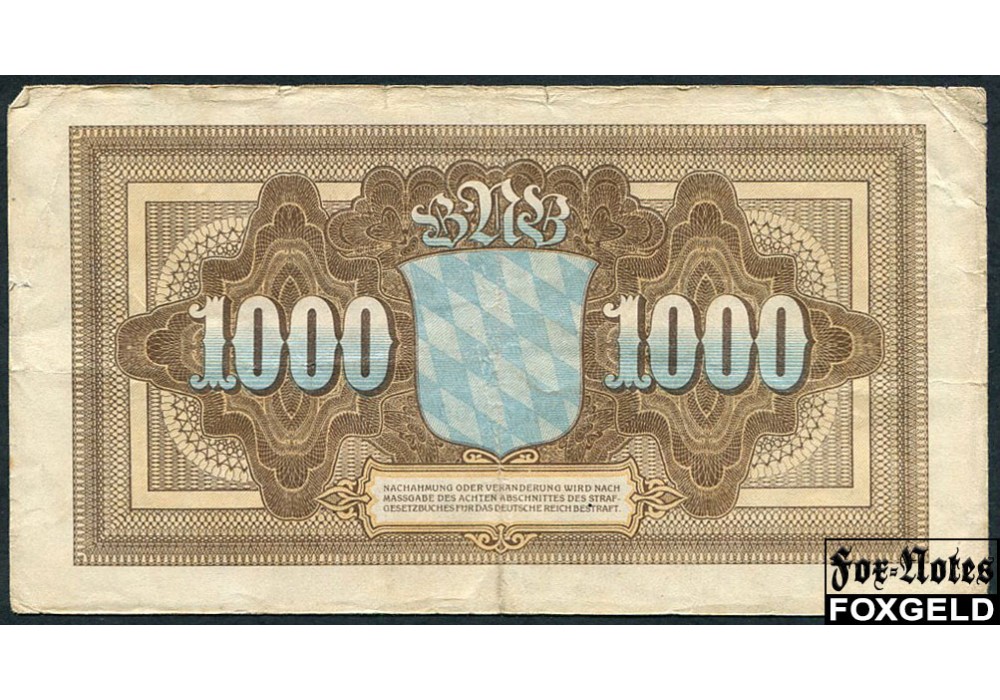 Bayerische Notenbank 1000 Mark 1922 VG-aF BAY5a 950 РУБ
