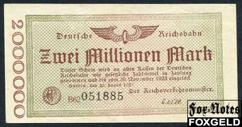 Германия Имперские ЖД Reichsverkehrsministerium Berlin 2 Mio. Mark 1923 WZ. Kelmuster/ # 4,7mm VF P:S1012b 002.3.d 250 РУБ