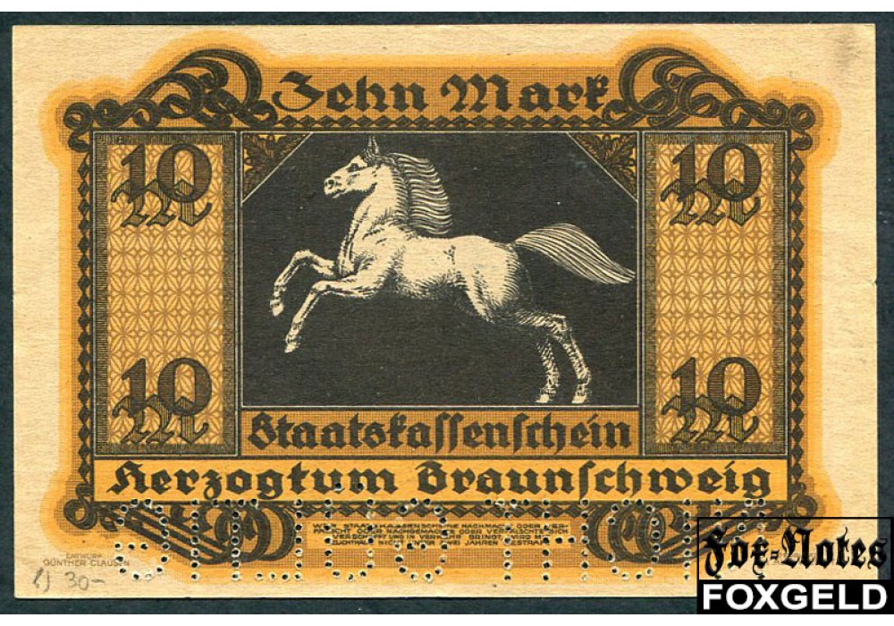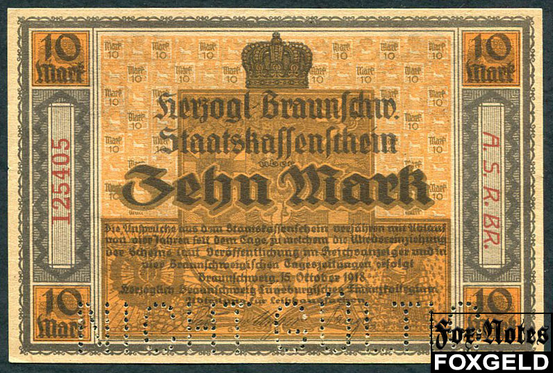 Braunschweig, Herzogtum 10 Mark 1918 слева #, справа ASRBR # 6 - 4,5 мм XF-aUNC BRS5h 750 РУБ