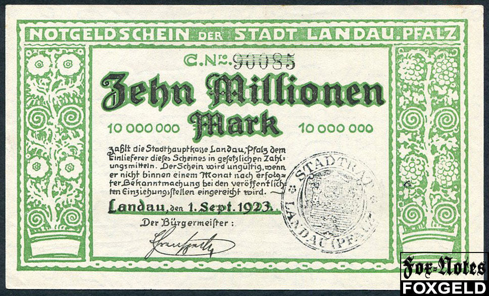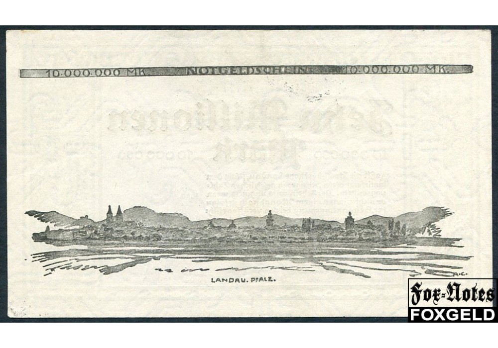 Landau in der Pfalz 10 Mio. Mark 1923 1. Sept. 1923. WZ. Hakenmaander #5mm aUNC B8:2878.c 600 РУБ
