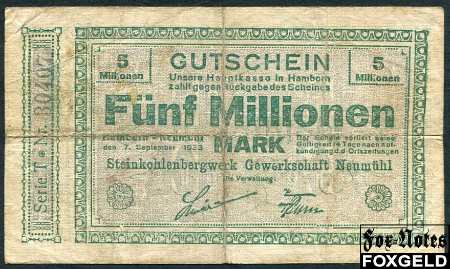 Hamborn-Neumuhl Rheinland 5 Mio. Mark 1923 Steinkohlenbergwerk Gewerkschaft Neumühl VG B7:2107.k 800 РУБ