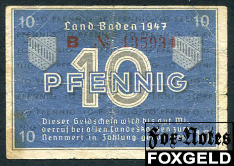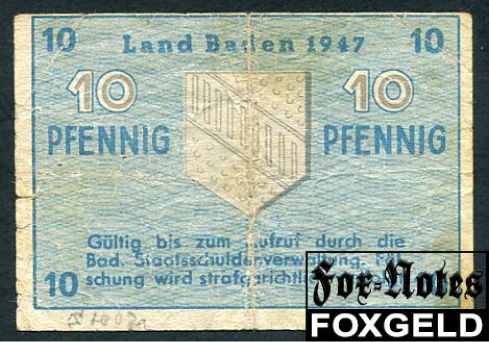 Baden. Staatsschuldenverwaltung. 10 Pfennig 1947 F Ro:209d 1000 РУБ