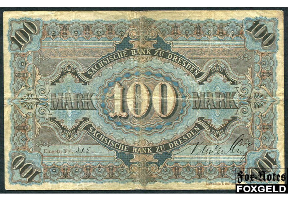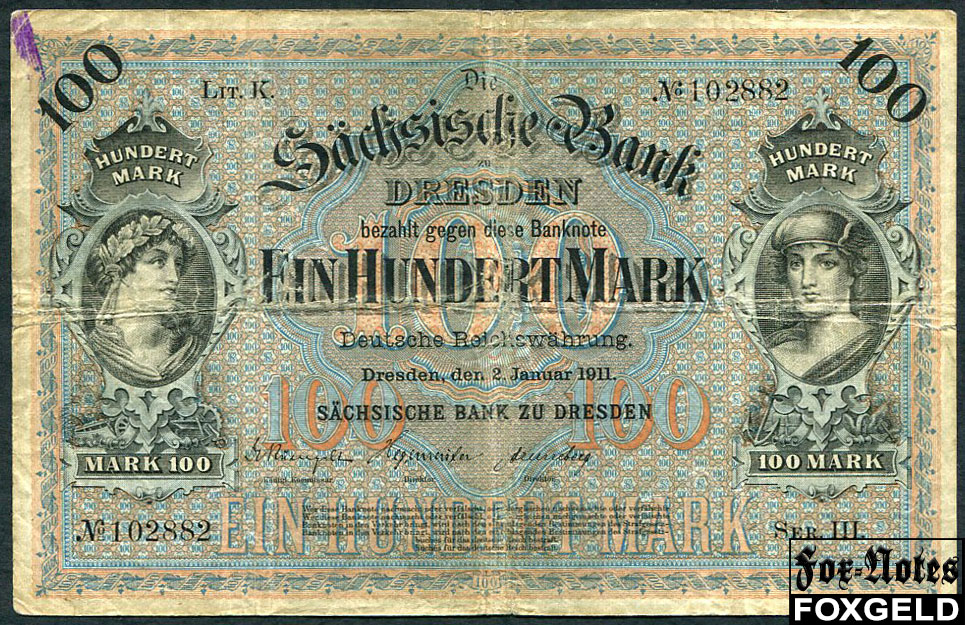 Sachsischen Bank zu Dresden 100 Mark 1911 SAX8a K№102882