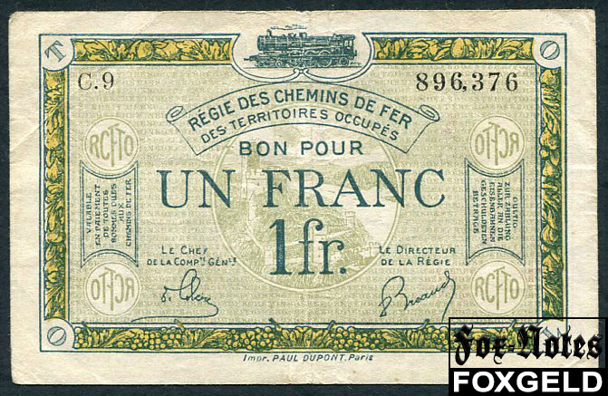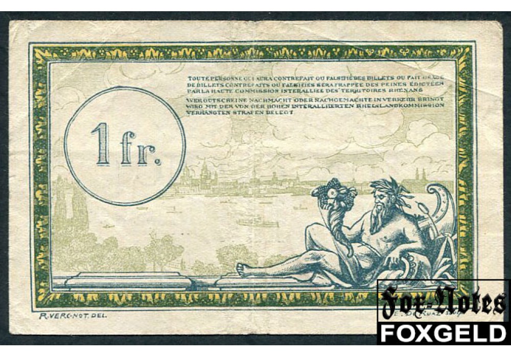 Regie des Chemins de fer des Territories Occupes Рейнланд 1 франк ND(1923) aVF Ro:859a 2500 РУБ