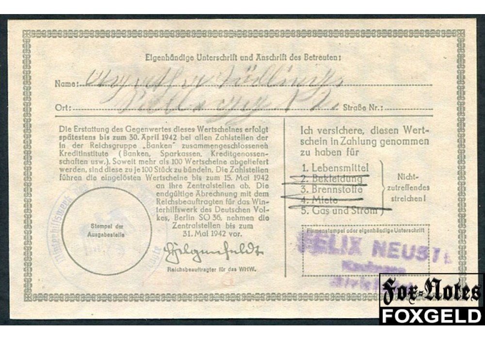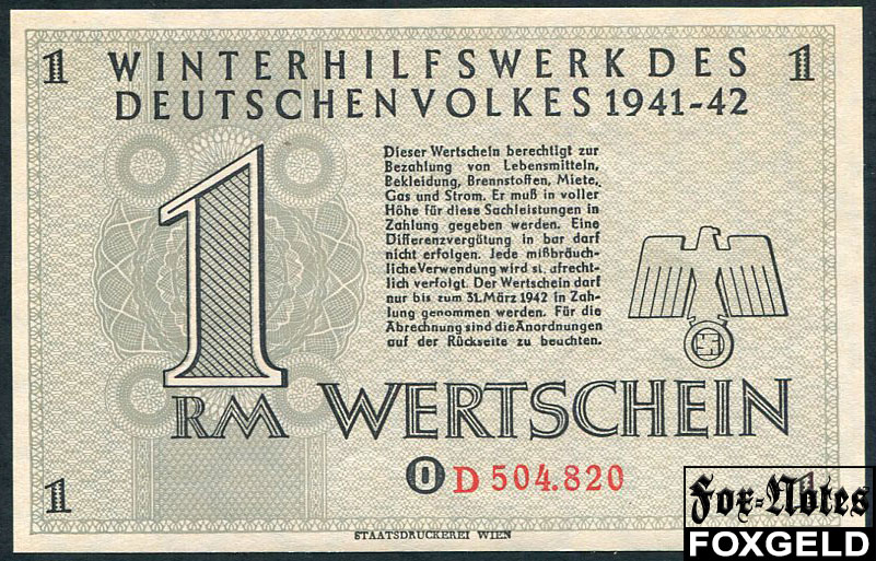 Winterhilfswerk des Deutschen Volkes Зимняя помощь немецкому народу 1 RM 1941-1942 aUNC Fr:1656 7500 РУБ