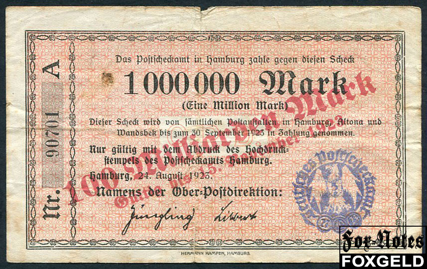 Oberpostdirektion in Hamburg 100 Mrd. Mark 1923 VG B13:7.b 2000 РУБ