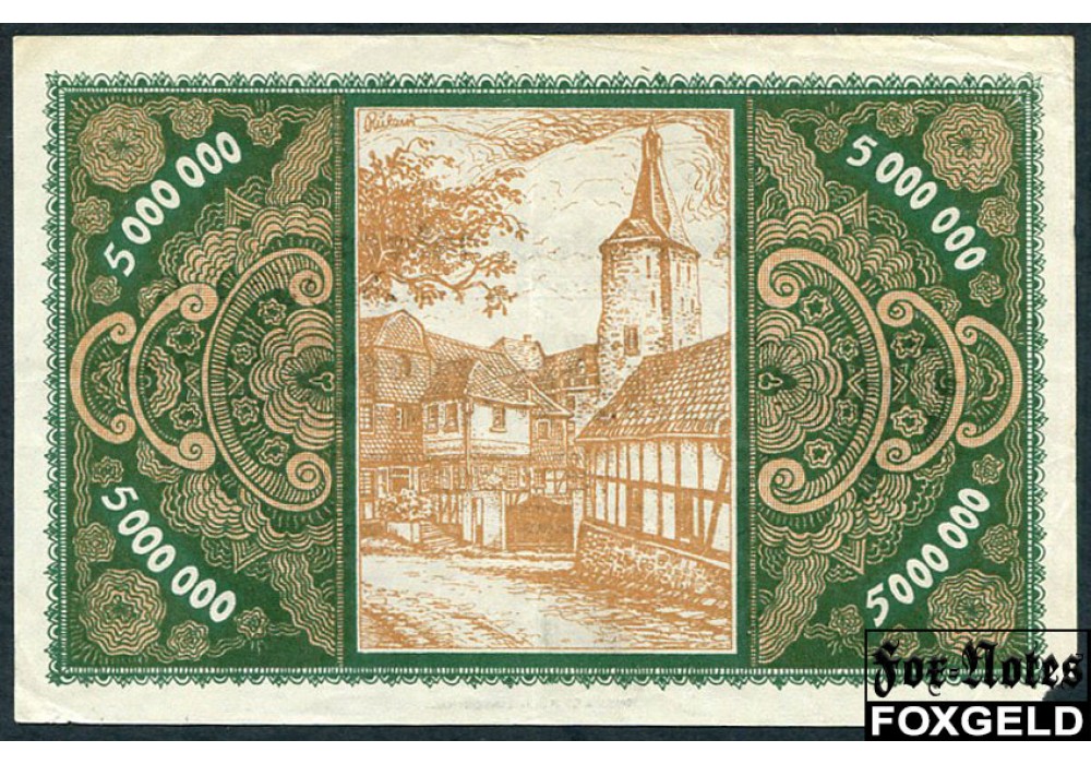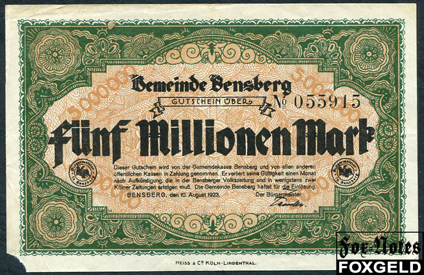 Bensberg Rheinland 5 Mio. Mark 1923 Gemeinde VG-aF B7:307.b 450 РУБ