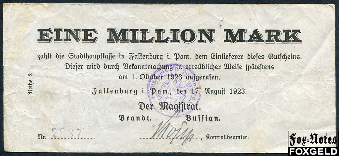 Falkenburg Pommern 1 Mio. Mark 1923 Stadt В7:1470.b №2837