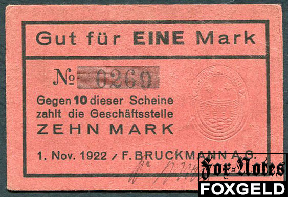 Munchen Bayern 1 Mark 1922 F. Bruckmann AG XF-aUNC №0269