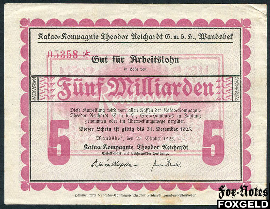Wandsbek Provinz Schleswig-Holstein 5 Mrd. Mark 1923 Kakao-Kompagnie Theodor Reichardt G. m. b. H. aVF B8:5449.d 2000 РУБ