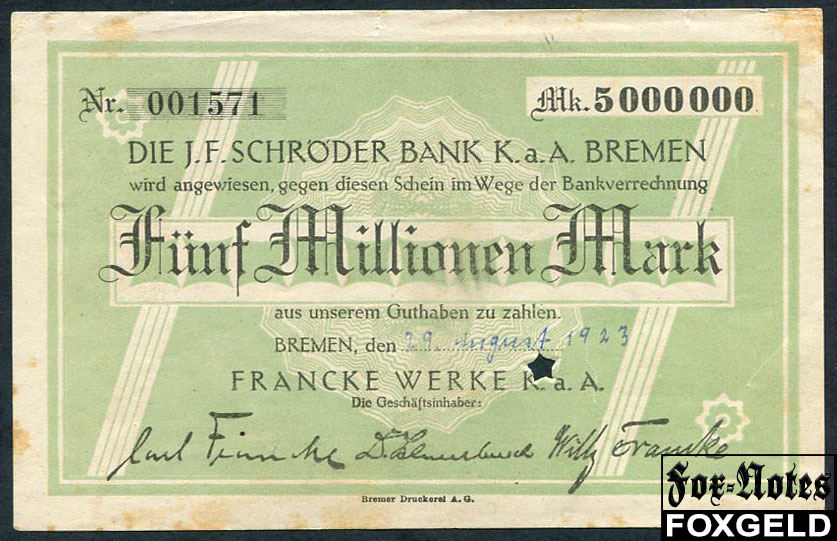Bremen 5 Mio. Mark 1923 Francke Werke K.a.A. В7:585.c №001571