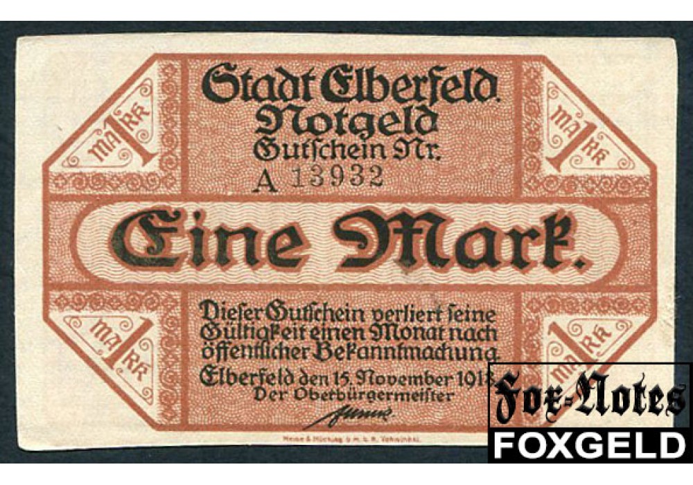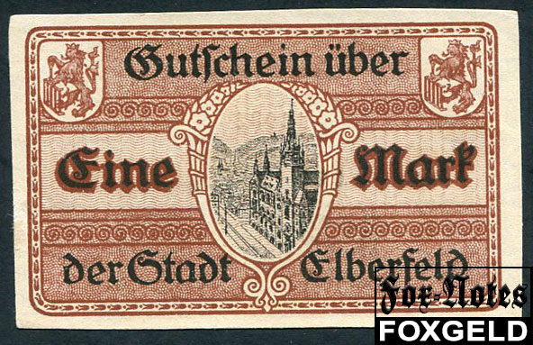 Elberfeld Rheinprovinz 1 Mark 1918 15.11.1918, Wz. Z-Muster, kleine KN, Serie A aUNC B3.124.09a 350 РУБ