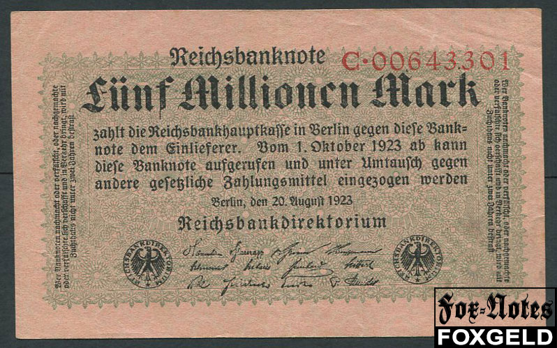 Германия Reichsbank 5 Mio. Mark 1923 20. August 1923. Reichsdrukerei VF+ Ro:104a 250 РУБ