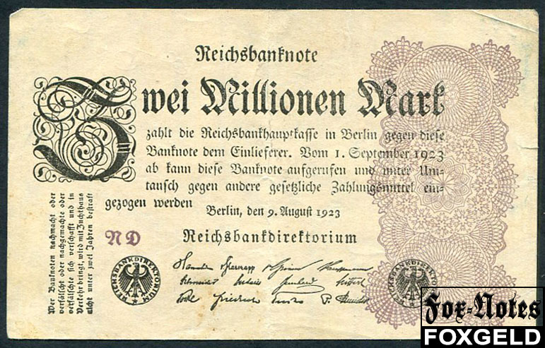 Германия Reichsbank 2 Mio. Mark 1923 9. August 1923. в/з Hakenstern ND (Niederrheinische Druckerei, Duisburg) VF Ro:103a 200 РУБ