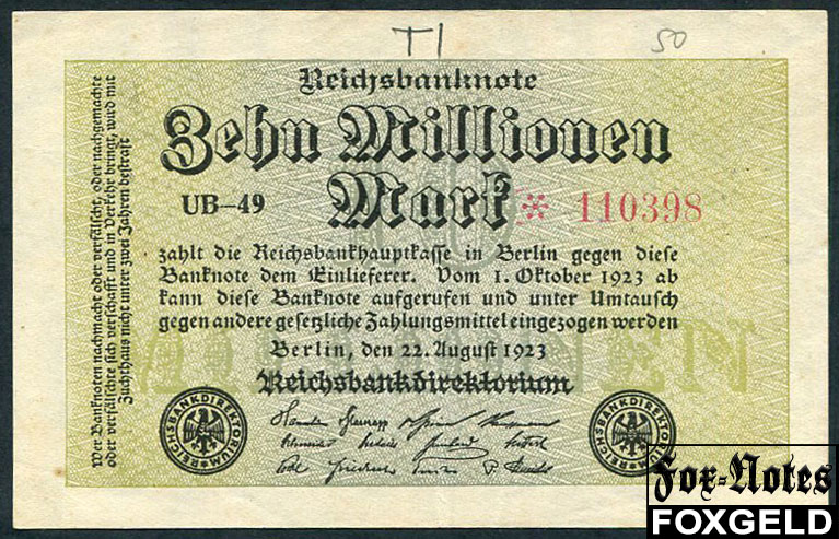 Германия Reichsbank 10 Mio. Mark 1923 22. August 1923. в/з Hakenstern UB (Ullstein, Berlin) XF Ro:105a 300 РУБ