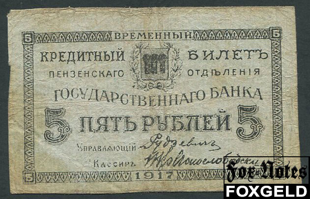 Пенза Отделение Государственного Банка 5 рублей 1918 F FN:F2520.2.1 24000 РУБ