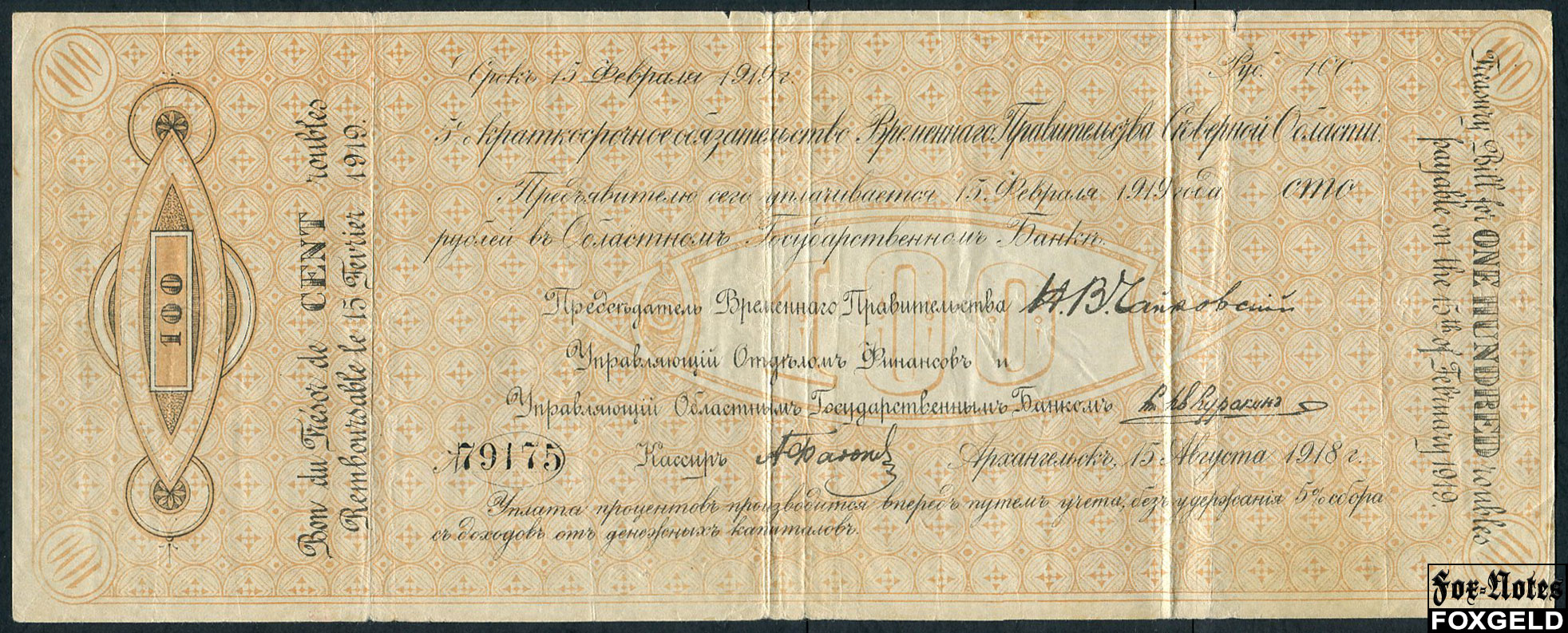 Северная Область 100 рублей 1918 Временное Правительство Северной Области F FN:E110.7.1c 3000 РУБ