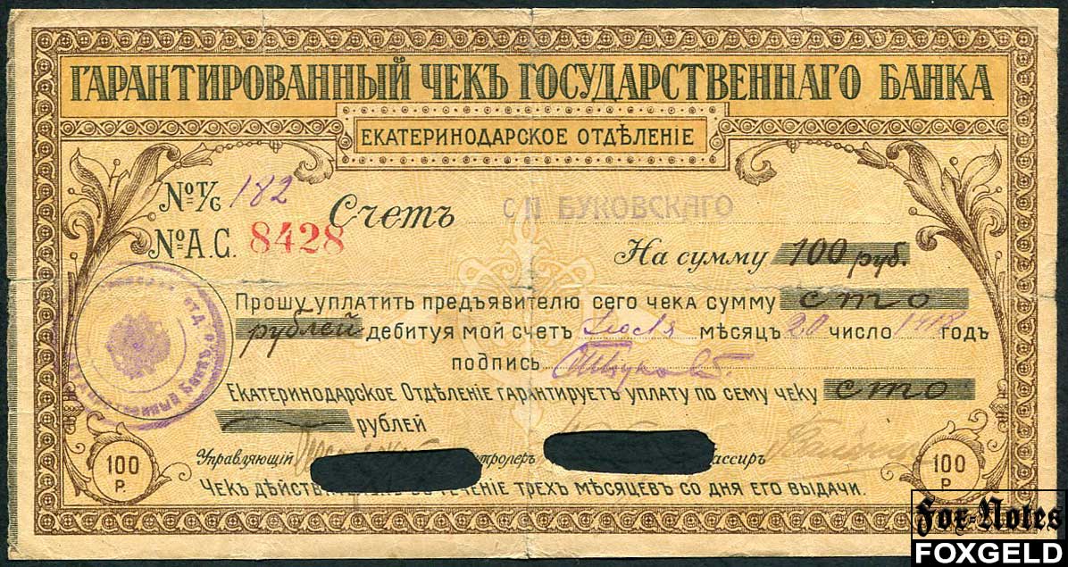 Екатеринодар Екатеринодарское Отделение Государственного Банка 100 рублей 1918 Чек действителен в течении трех месяцев Счет-182 печать a) VG FN:Е246.2.1a 2000 РУБ