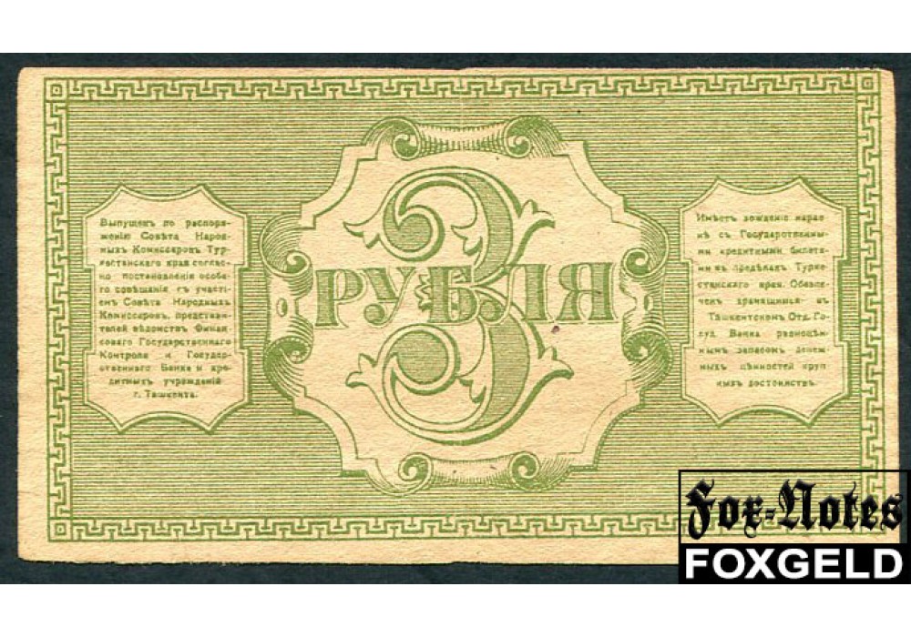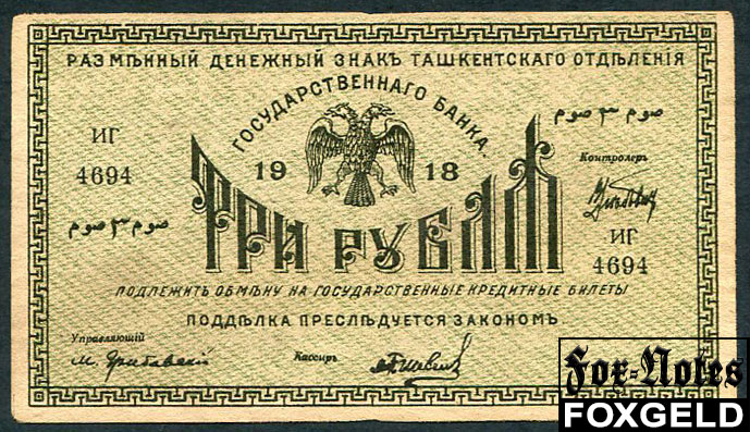 Ташкентское Отделение Государственного Банка 3 рубля 1918 Литера Г. Кассир Шевелев (редкий кассир) Fine FN:Е250.2.1 5000 РУБ
