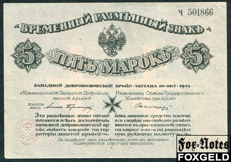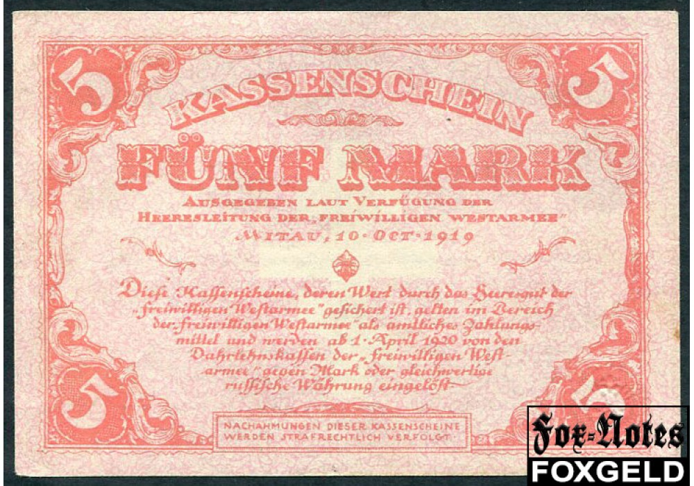 Западная Добровольческая Армия Авалов-Бермондт 5 марок 1919 С конгревом. XF-aUNC FN:Е135.2.1a 12500 РУБ