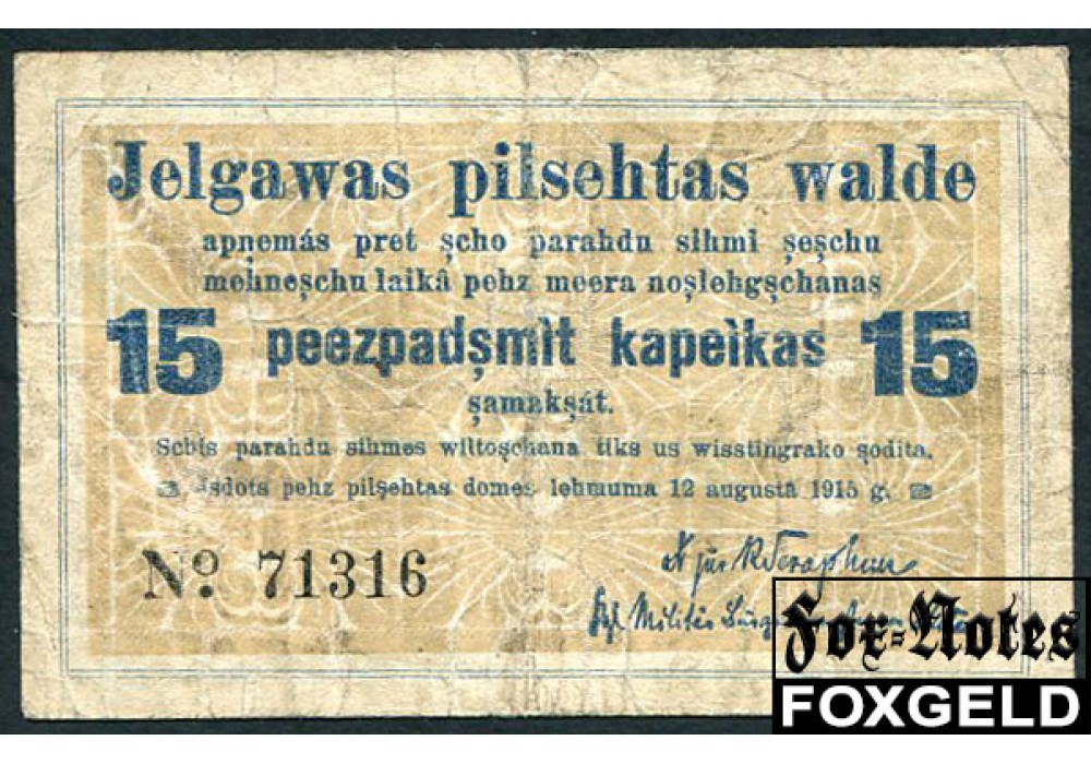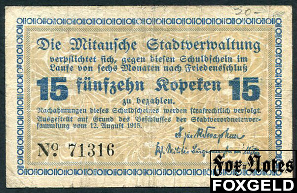 Митава Mitausche Stadtverwaltung 15 копеек 1915 Mitau, den 12. August 1915. В тексте "zu bezahlen" F FN:F2000.12.1b 4000 РУБ