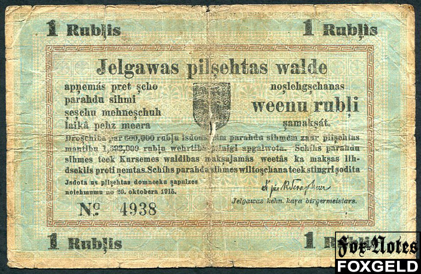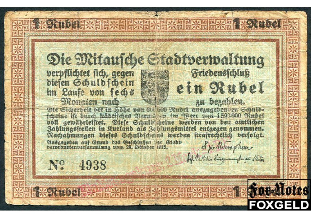 Митава Mitausche Stadtverwaltung 1 рубль 1915 No#4-5. Вар. текста о.с. - 1 (Rublis ... mehneschuh) G FN:F2000.26.1a 6500 РУБ