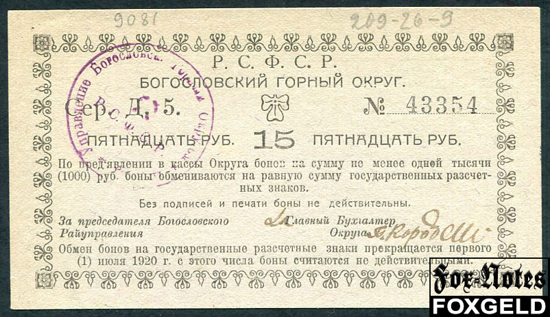 Надеждинск Богословский Горный Округ 15 рублей ND(1919) aUNC FN:F2131.7.1 / K10.26.9 3500 РУБ