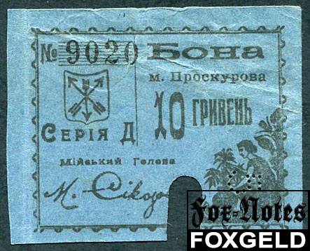 Проскуров Проскурiвський Мiйський Банк 10 гривен ND(1919) 2-й выпуск (действительна до 15.10.1920) F FN:F2680.6.2a 2200 РУБ