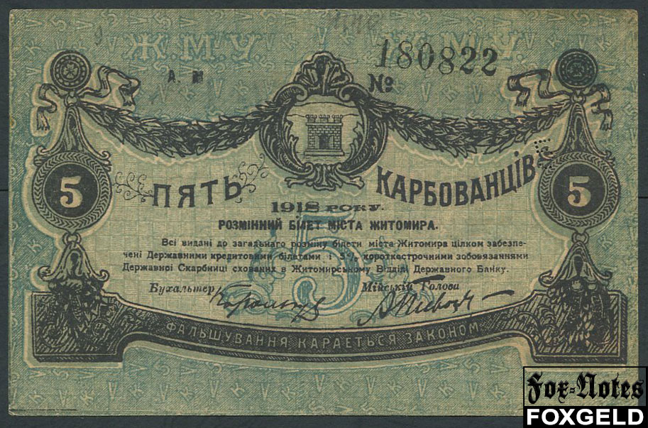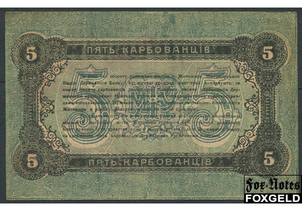 Житомир Городское самоуправление 5 карбованцев 1918 Высота нумератора 7 мм F+ FN:F1180.3.1 2000 РУБ