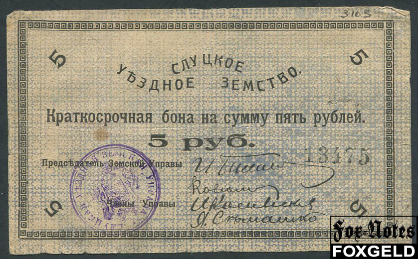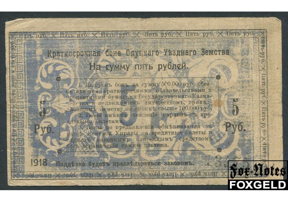 Слуцк Слуцкое Уездное Земство 5 рублей 1918 FN:F3030.3.1 13475