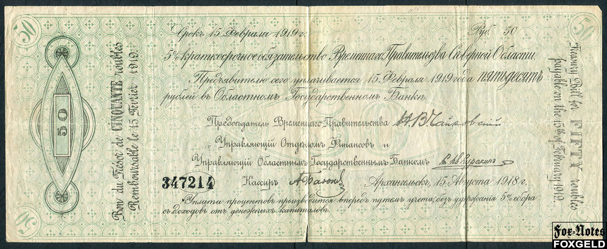 Северная Область 50 рублей 1918 Временное Правительство Северной Области VG FN:E110.6.1 2100 РУБ