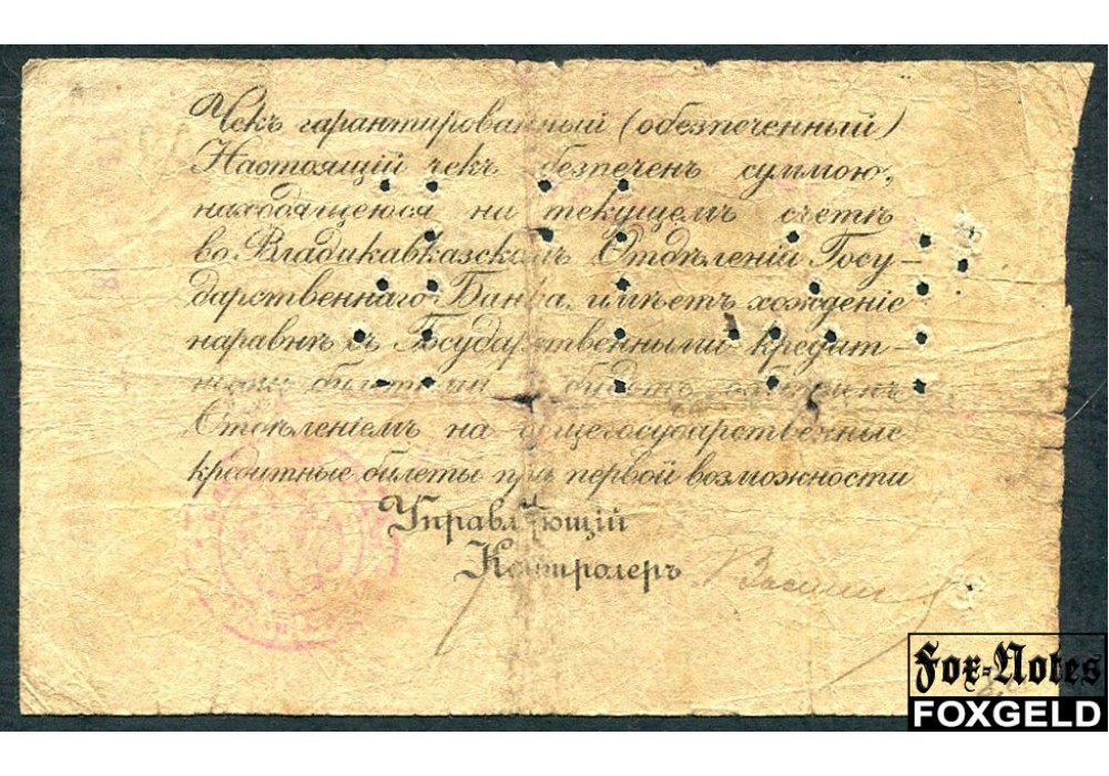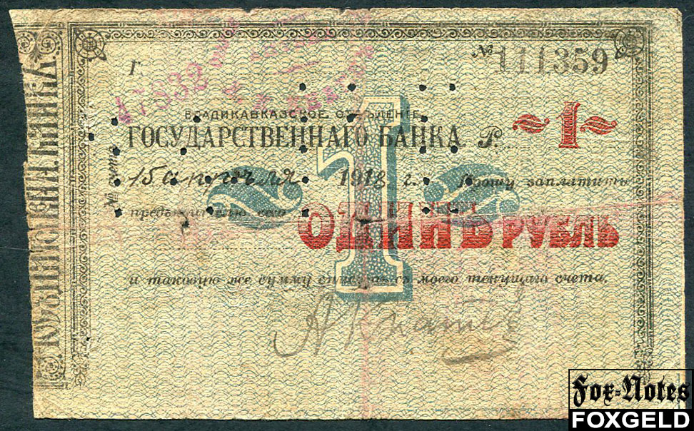 Владикавказское Отделение Государственного Банка Владикавказ 1 рубль 1918 Тип 2 (Рамка без текста. Подписи на о.с. рукописные.) VG+ FN:F730.9.2 3000 РУБ