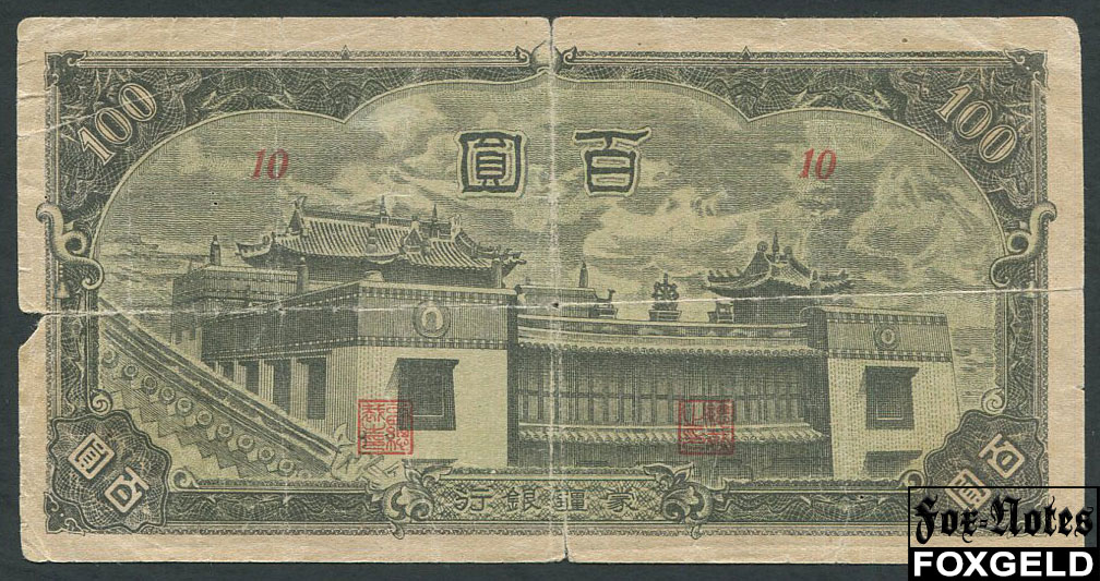 Meng Chiang Bank Китай 100 юаней ND(1945) монастырь P:J111 10 {2}