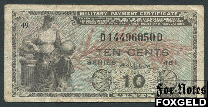США Military Payment Certificate 10 центов ND(1951) SERIES 481 в обращении с 20.6.1951 по 25.5.1954 F P:M23 500 РУБ