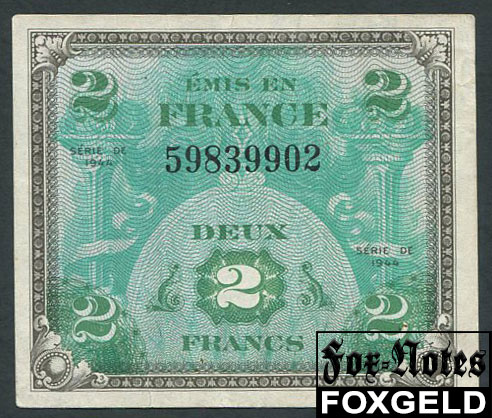 Франция 2 франка 1944 Военный выпуск ФЛАГ Типография Bureau of Engraving and Printing aXF P:114a 650 РУБ