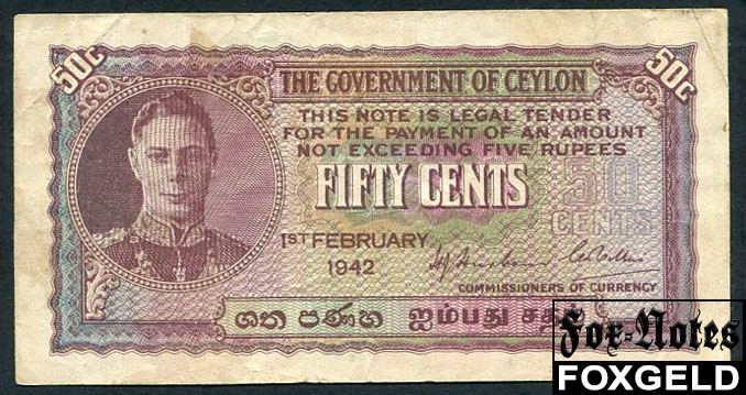 Цейлон 50 центов 1942 F P:45a 4500 РУБ