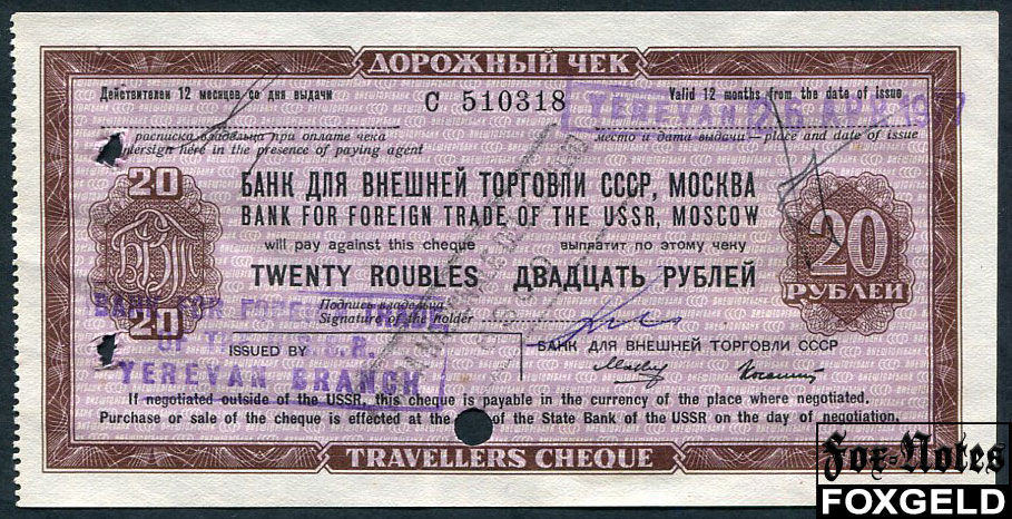 Банк для Внешней Торговли СССР 20 рублей ND(1967) Дорожный чек Макеев Колашин. Без ограничительной надписи VF И 7.8.3 7000 РУБ