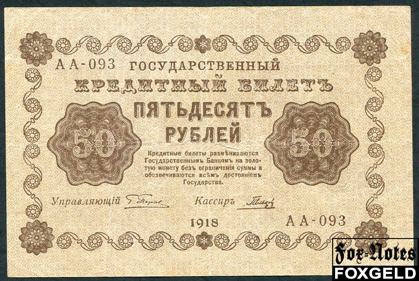 РСФСР 50 рублей 1918 ПФГ. Гальцов FN:114.1a АА-093 {1}