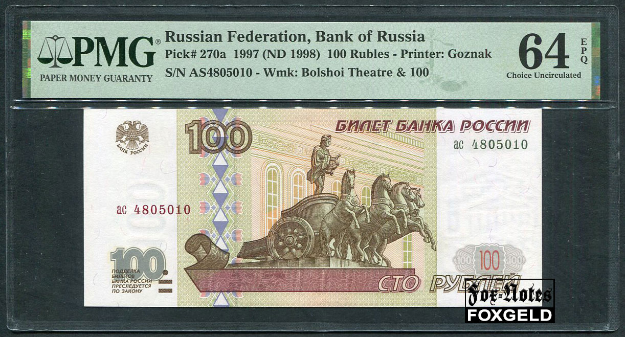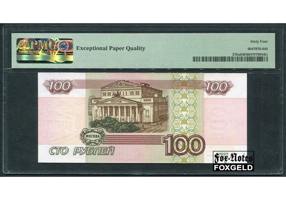 Российская Федерация Россия 100 рублей 1997 Слаб PMG 64 Ch UNC FN:253.1 10000 РУБ