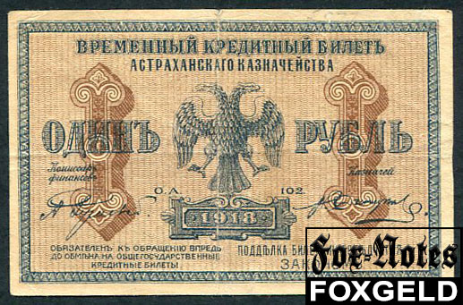 Астрахань Астраханское Казначейство 1 рубль 1918 Вариант по цвету фона реверса F FN:F170.1.1 7500 РУБ