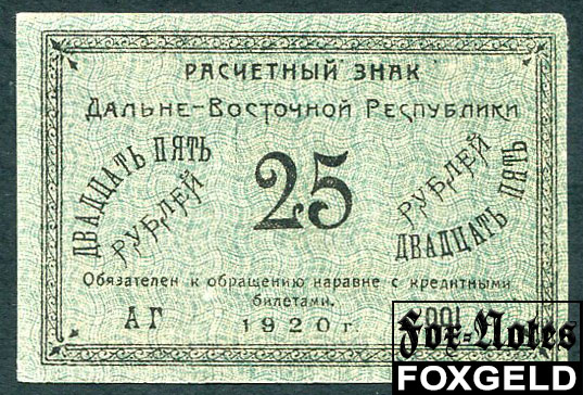 Дальне-Восточная республика ДВР 25 рублей 1920 XF-aUNC FN:Е65.5.1 3500 РУБ