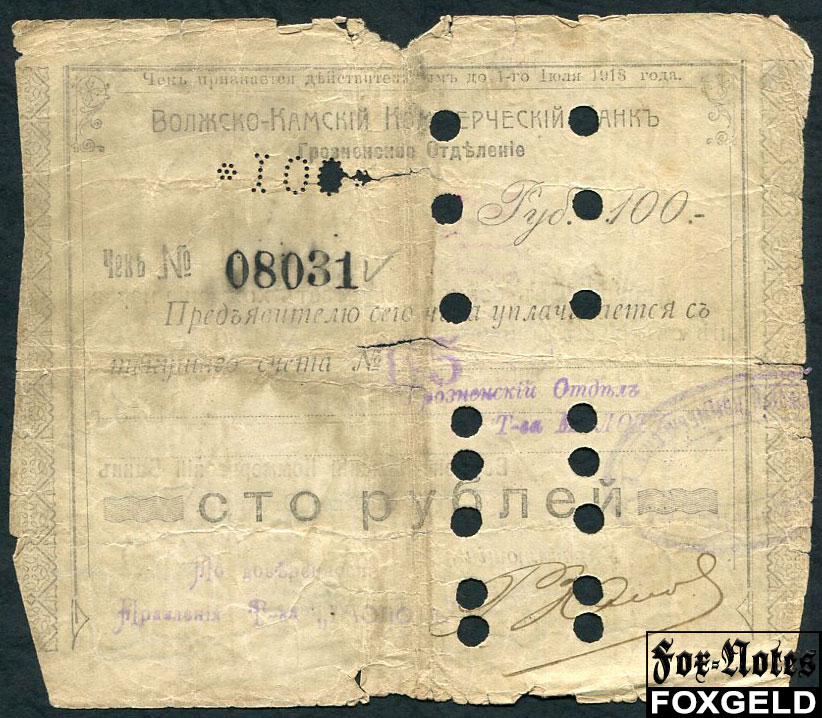 Грозный Волжско-Камский Коммерческий Банк 100 рублей 1918 Клише тип 1. Счет №65. Грозненский Отдел Товарищества "Молоть". G FN:F973.4.1a 2800 РУБ