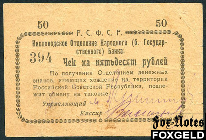 Кисловодск Кисловодское Отделение Народного Банка 50 рублей ND(1919) aVF FN:F1541.1.1 1800 РУБ