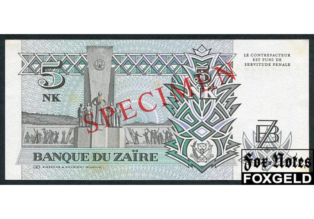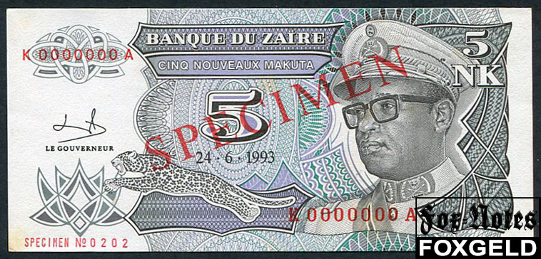Заир 5 новых макут 1993 SPECIMEN Образец aUNC P:48 K0000000A